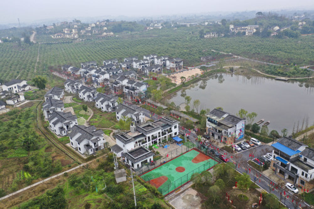 ↑重庆长寿区“慢城”的田园风光和统一规划的村庄(2019年12月24日无人机照片)。新华社记者 刘潺 摄