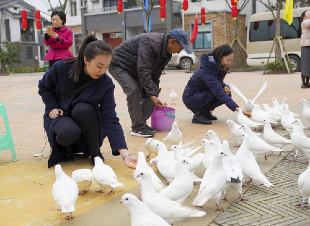 ↑在重庆长寿区“慢城”中主打“白墙青瓦素雅风”的秀才湾居民点广场,游客在给观赏鸽喂食(2019年12月24日摄)。新华社记者 刘潺 摄