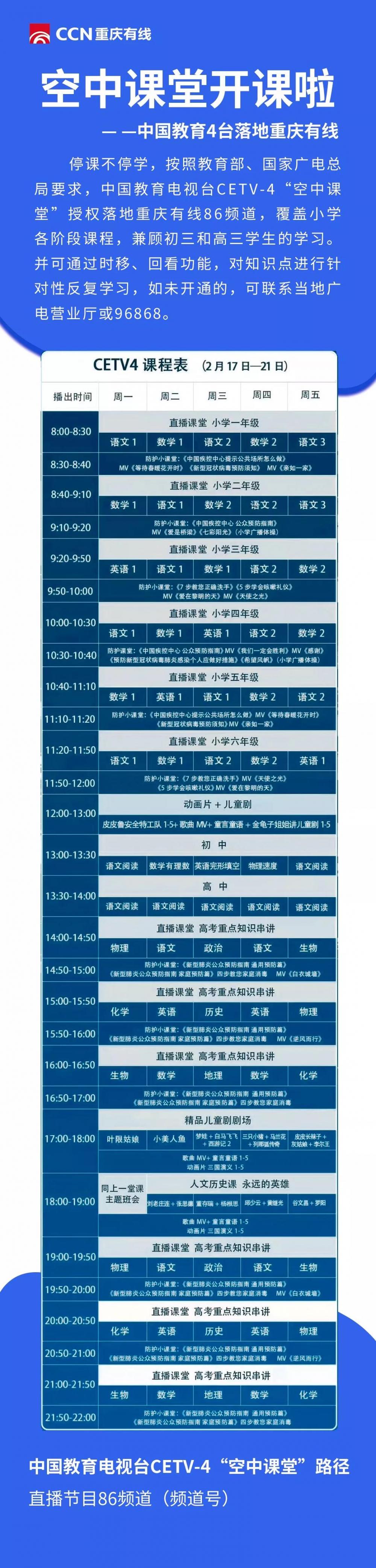 停课不停学,按照教育部、国家广电总局要求,中国教育电视台CETV-4“空中课堂”授权落地重庆有线86频道,覆盖小学各阶段课程,兼顾初三和高三学生的学习。并可通过时移、回看功能,对知识点进行针对性反复学习,如未开通的,可联系当地广电营业厅或96868。